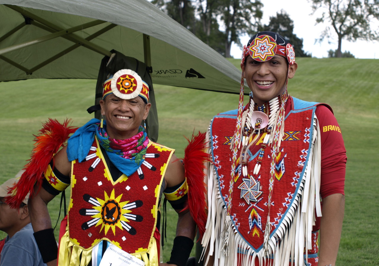 Boye Ladd Jr., right, and Perry Thompson dress in traditional Native American dress to dance the dances of their ancestors. (Kim Higley)