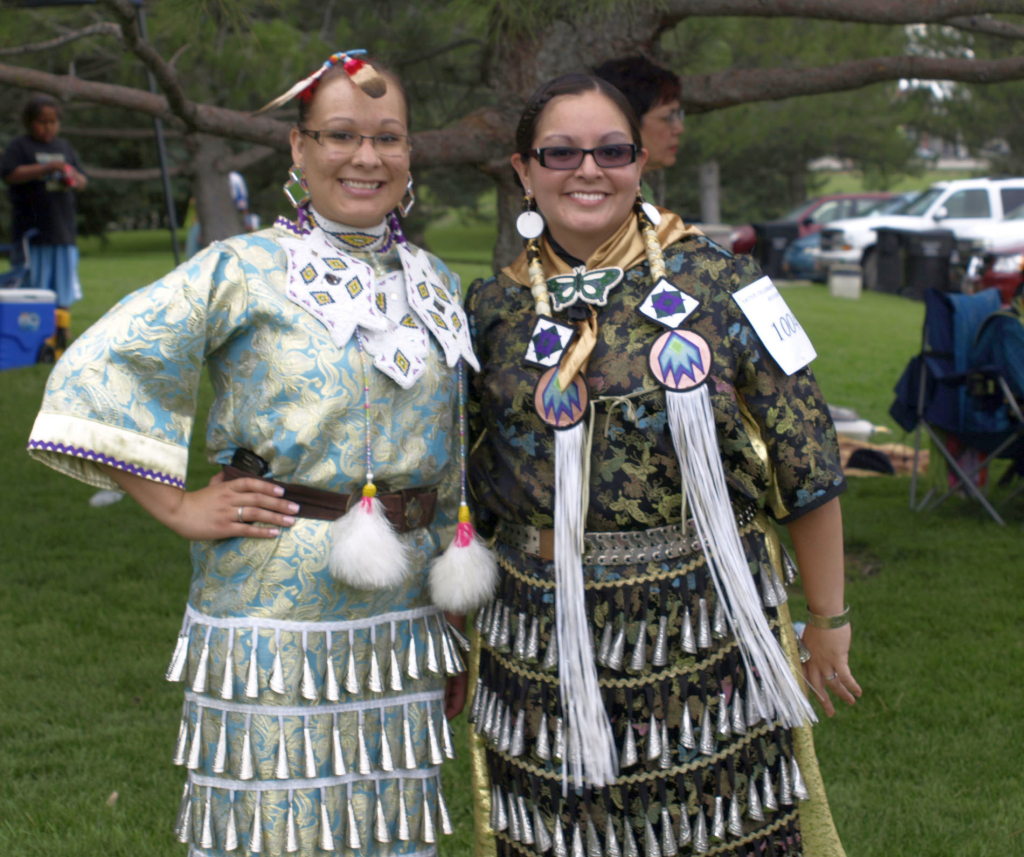 Kory Bouwhuis, right, shows off her traditional style Jingle Dance dress while Kami First Raised, left, models a more contemporary style (Kim Higley)