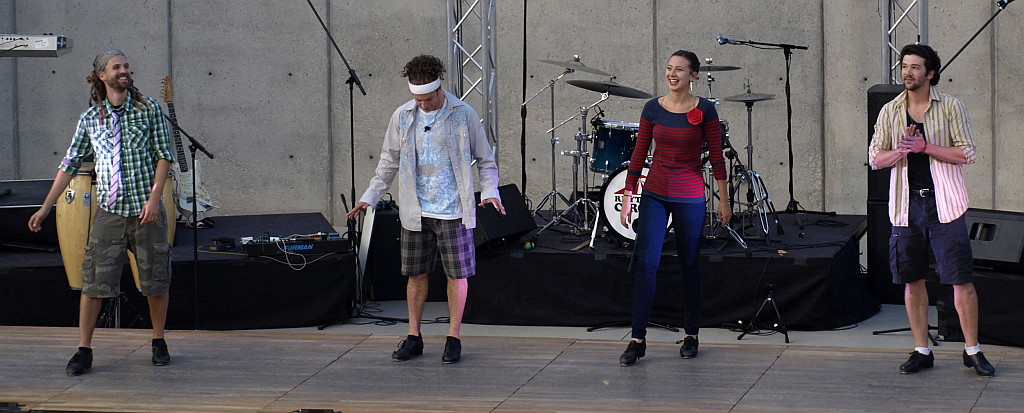 From left to right: Dancers Nick Bowman, Ricci Milan, Kaleena Miller and Mike Keefe preform the first of the fancy footwork in “A Capella Taps.” (Kim Higley)