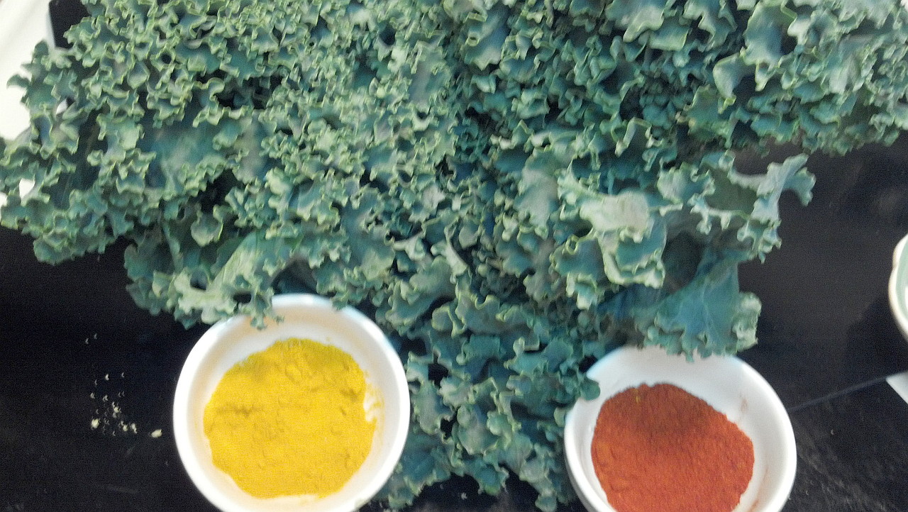 Place the coated kale on a dehydrator sheet and dry for 4-6 hours at 115 degrees or until they are crisp.