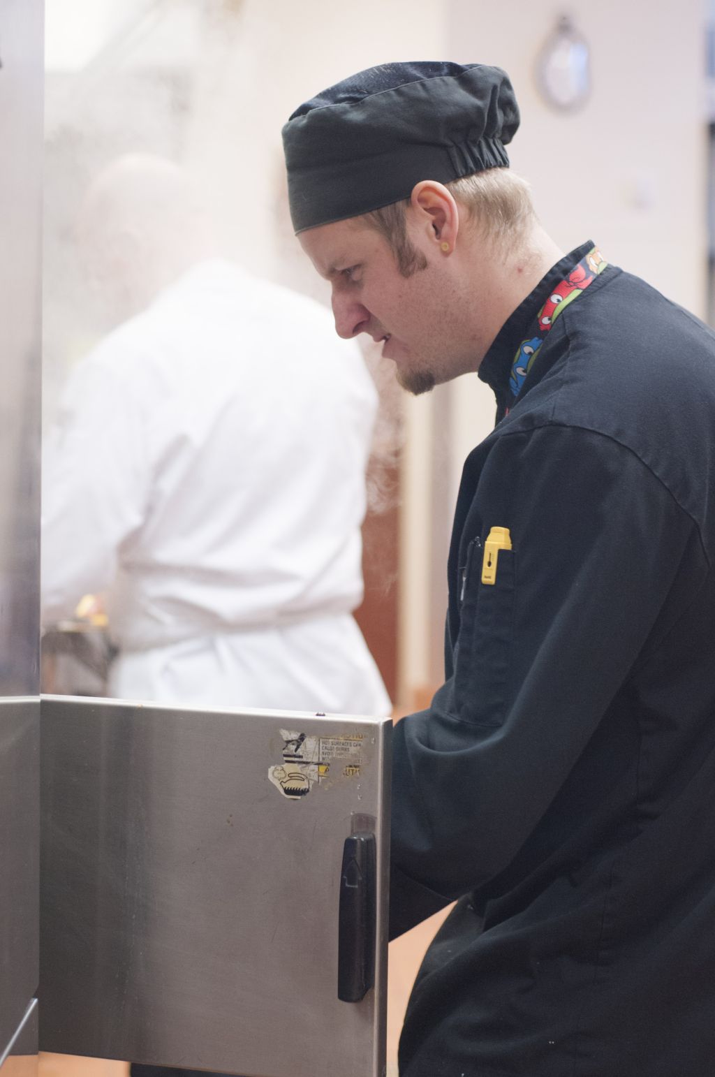 A culinary student is placing a pan into a oven during breakfast service at the Utah State Capitol cafeteria.