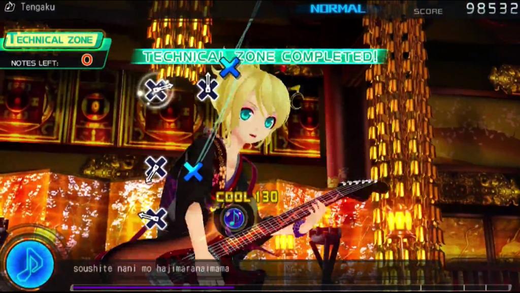 Project DIVA F plays by using the face buttons on the controller in beat to the music. Symbols, representing the buttons, fly on the screen and must be pressed in time; with variations including holding two buttons at once, holding the button for a period of time and even flicking the control sticks. The game is very unforgiving, and though it does its best to teach the player how to play, it can overload the senses.