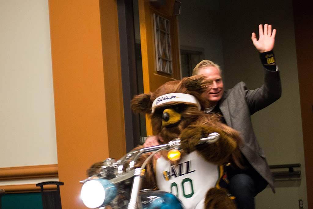 Salt Lake Comic Con founder Dan Farr gets a lift to the opening press conference from Jazz Bear. (James Nguyen)