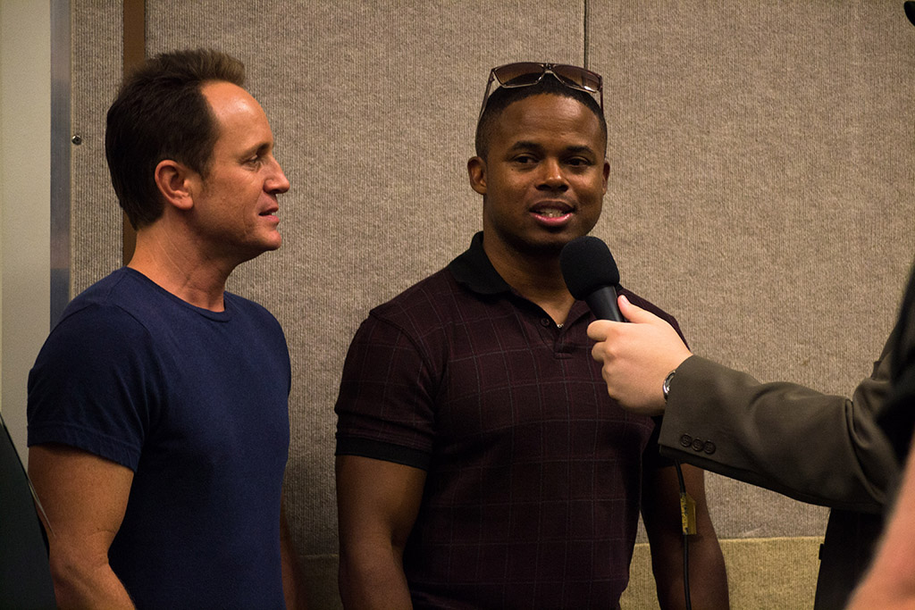 David Yost (left, Blue Power Ranger) and Walter Jones (Black Ranger) speak to local media at Salt Lake Comic Con 2013. (James Nguyen)
