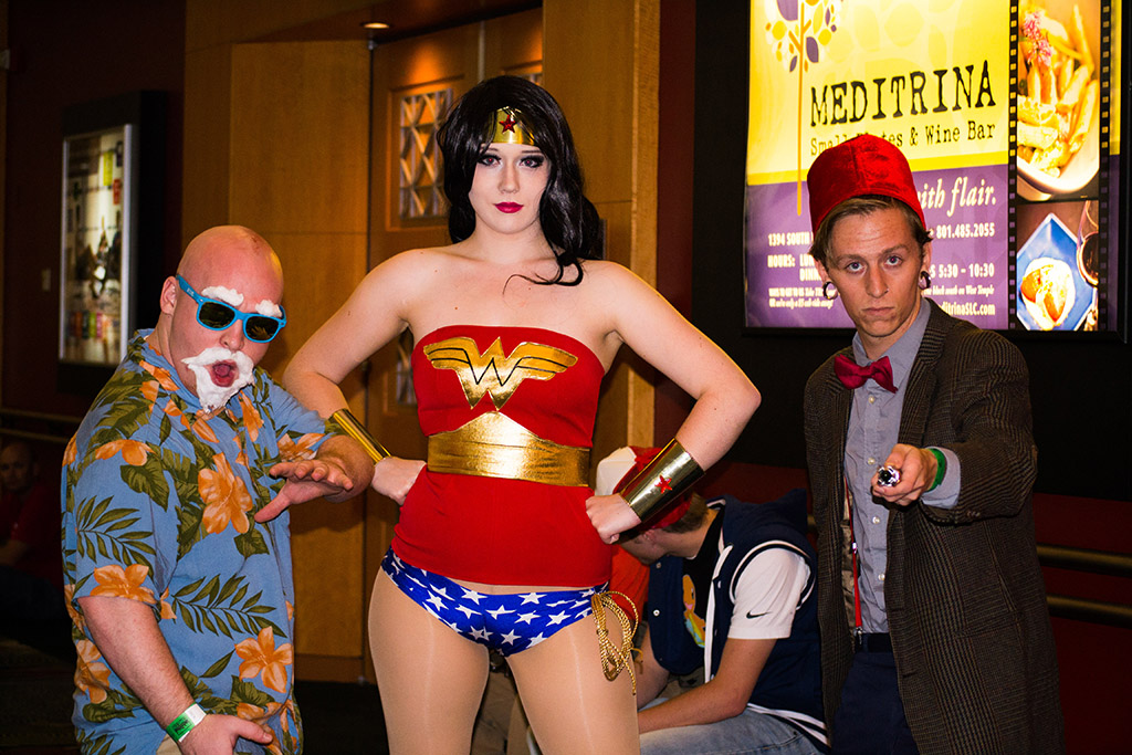 Left to right: Shand Davis (Master Roshi, Dragonball Z), Kelly Allred (Wonder Woman) and Cris Benoit (11th Dr Who) in costume at Salt Lake Comic Con 2013. (James Nguyen)