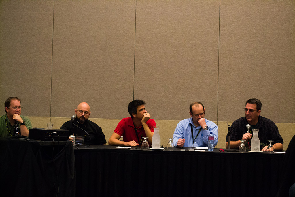 Panel from “The History and Culture of Video Games” at Salt Lake Comic Con 2013. From left to right: Patrick Hayes, Jose Siegal, Shane Smit, Roger Altheizer, Robert Hayes (James Nguyen)
