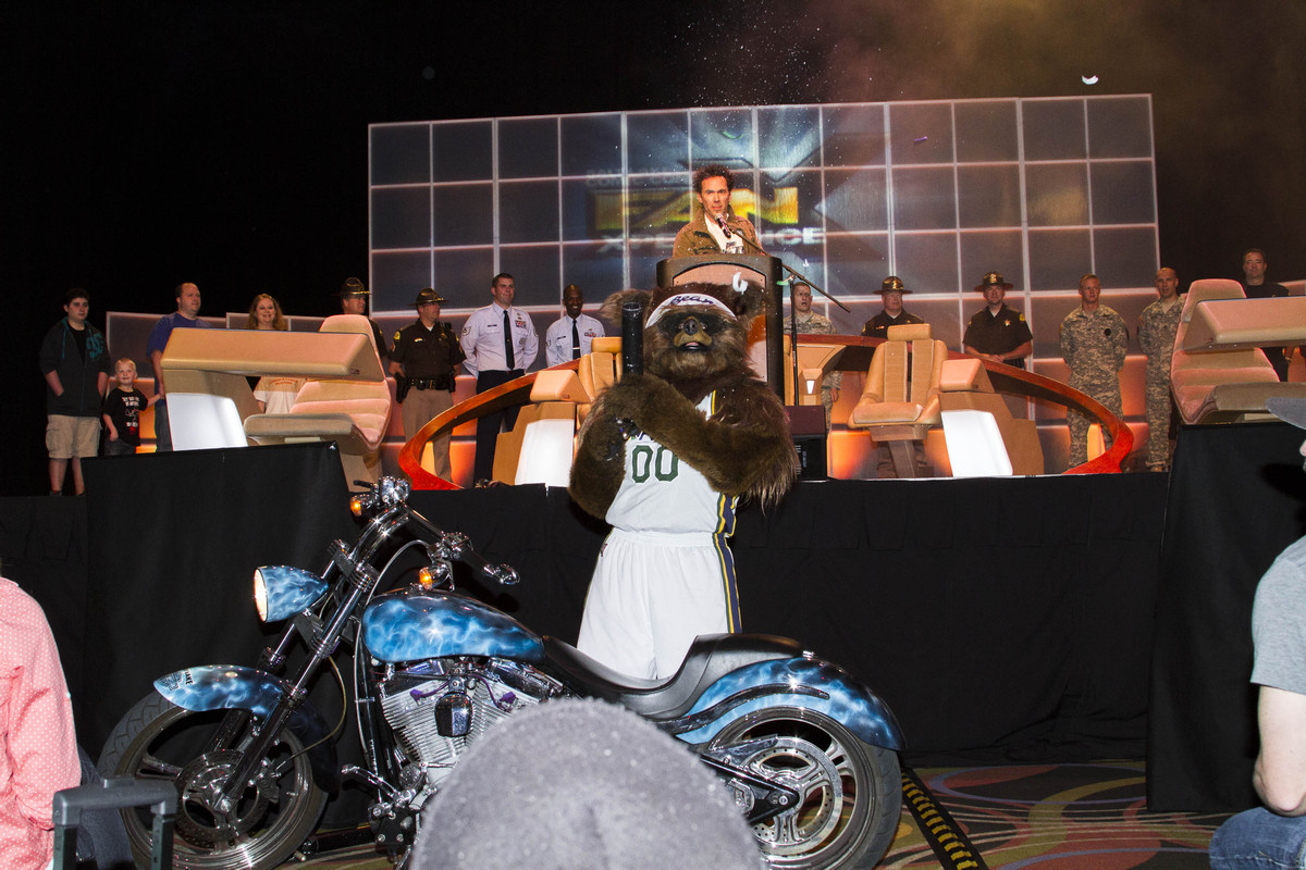 Jazz Bear arrives at the FanX 2014 opening Press Conference in the only way the Bear rolls. (Jimmie Breedlove)