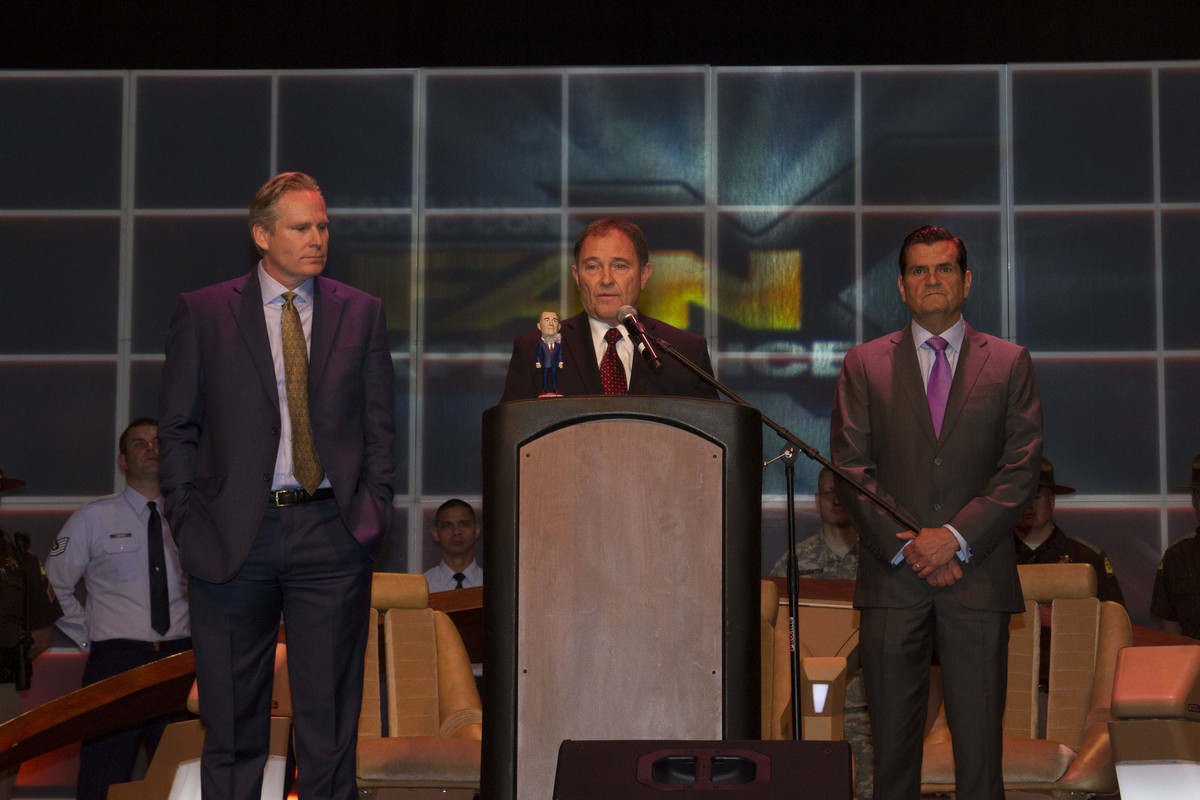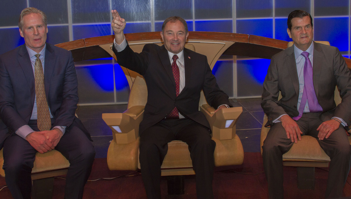 Gary Herbert (center) joins Dan Farr (left) and Bryan Brandenburg at the helm of Fan Xperience in Salt Lake City on April 17. (Jimmie Breedlove)