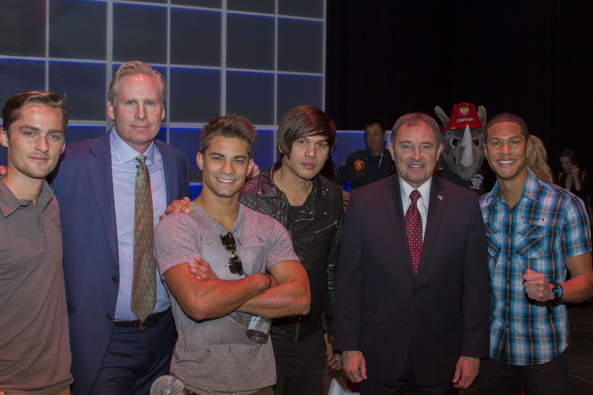 Some of the Power Rangers stand as bodyguards for Governor Herbert (2nd from right) and Dan Farr (2nd from left). Pictured, left to right: Alex Heartman, Dan Farr, Hector David Jr, Steven Skyler, Governor Gary Herbert, Najee De-Tiege (Jimmie Breedlove)