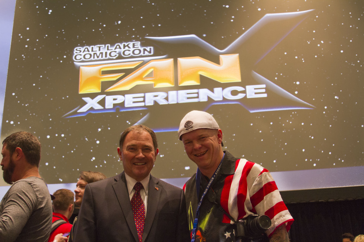 Governor Herbert (left) joins Globe photographer Jimmie Breedlove for a photo at FanX 2014 in Salt Lake City. (Aldo Gomez)
