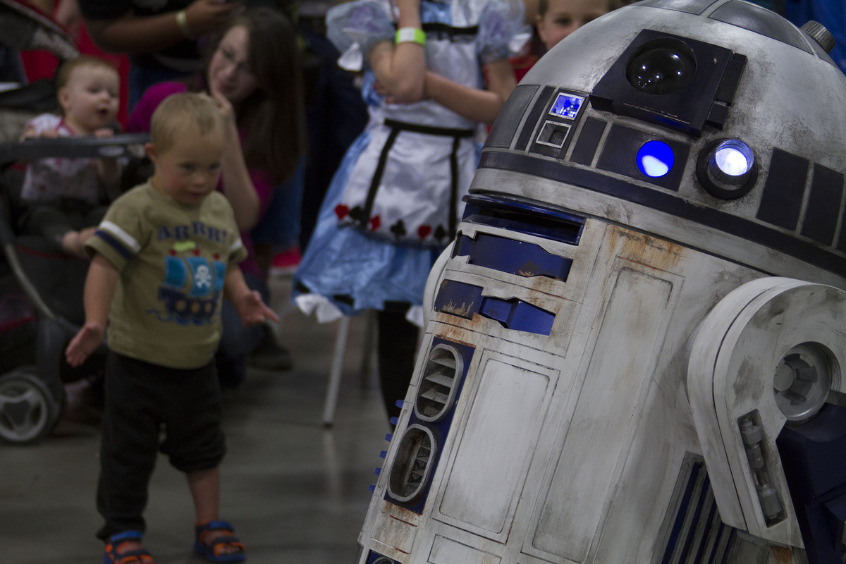 David Platt isn’t sure what to think of R2-D2 at FanX 2014 in Salt Lake (Jimmie Breedlove)