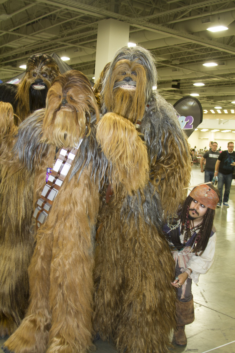 Jack Sparrow photobombs a group of Chewbaccas at FanX 2014 in Salt Lake City. (Jimmie Breedlove)