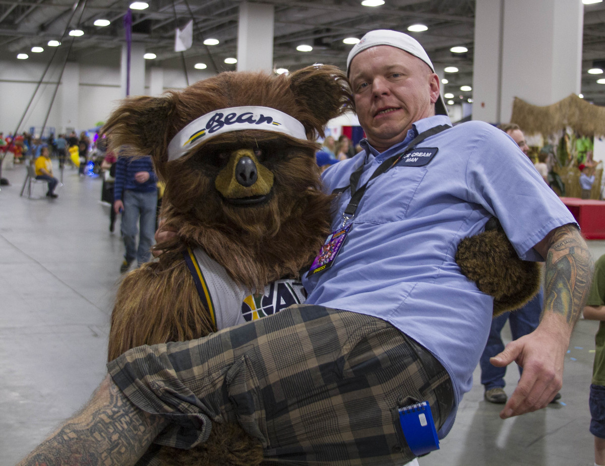 Jazz Bear sweeps Globe photographer Jimmie Breedlove off his feet at FanX 2014 in Salt Lake City. (Jimmie Breeedlove)