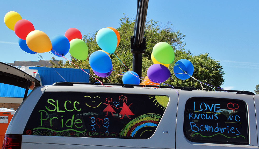 Walking behind a #inclusivitySLCC banner, a large contingent of SLCC Pride supporters assembled with bright smiles and signs, wearing blue t-shirts with a vest pattern, international symbols of peace and love and the SLCC logo over the heart.