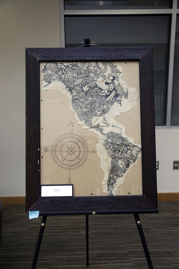 One piece at the showcase seemed to serve as a centerpiece for all of his present artwork. He entitled it “Human Life” which depicted North, Central, and South America in a sort of collage comprising familiar symbols.