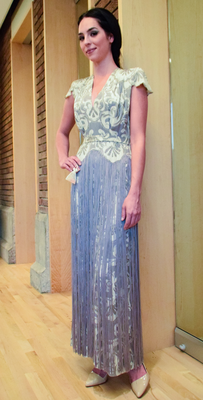 The silver gown is adorned with long fringe, which is unique since fringe is typically associated with short, flapper style dresses.