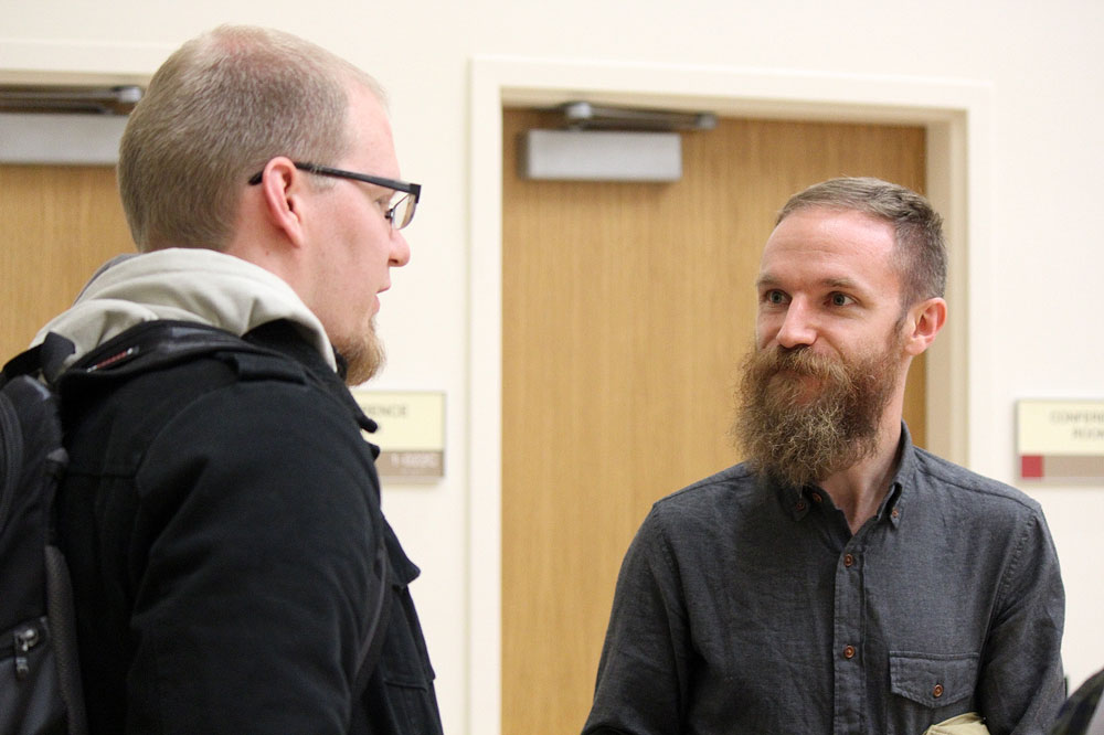 Adam Davies talks to a SLCC student Jan. 26 at the Center for Arts and Media. Davies is the animator for the film short “The Itching” which debuted at Sundance Film Festival 2016. (Tamara Brune-Wharton)