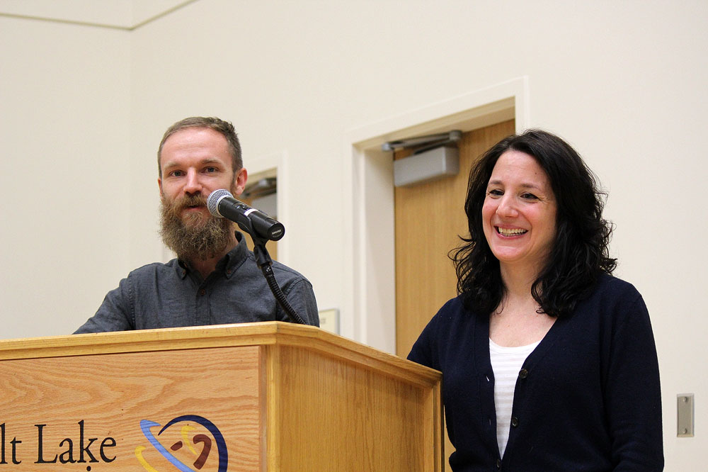 Adam Davies and Dianne Bellino talk to SLCC film and animation students Jan. 26 at the Center for Arts and Media. Davies and Bellino are in town for the debut of their short film “The Itching” at the Sundance Film Festival. (Tamara Brune-Wharton)