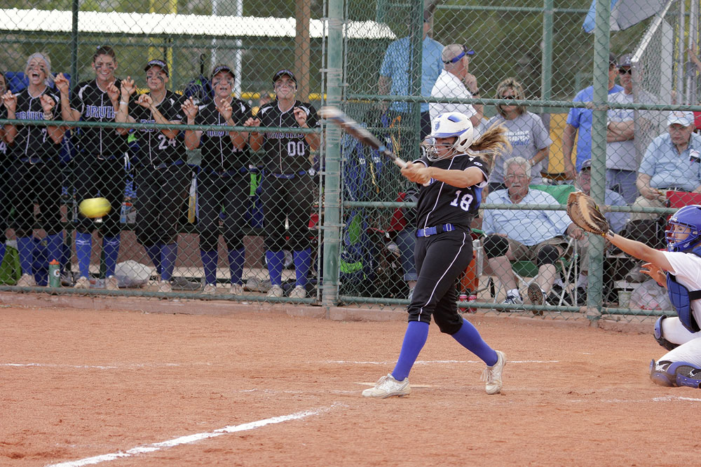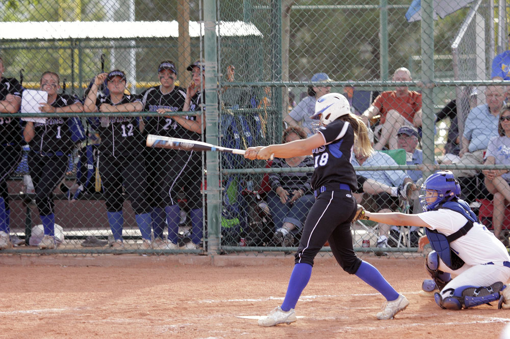 SLCC outfielder Tina Ford makes contact during her at-bat in a second-round NJCAA tournament game against Northeastern Oklahoma A&M on Friday, May 19. (EJ Kirschner)