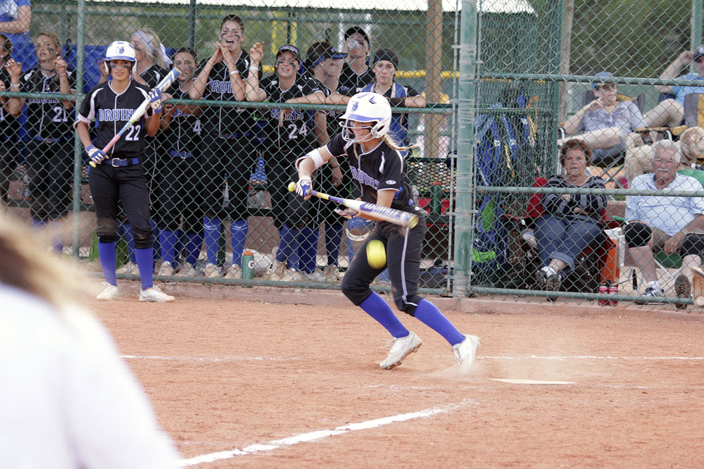 SLCC outfielder Tina Ford bunts the ball during a second-round NJCAA tournament game against Northeastern Oklahoma A&M on Friday, May 19. (EJ Kirschner)