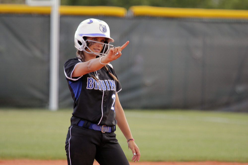 SLCC utility player Brittni Chase signals from the bases during a second-round NJCAA tournament game against Northeastern Oklahoma A&M on Friday, May 19. (EJ Kirschner)