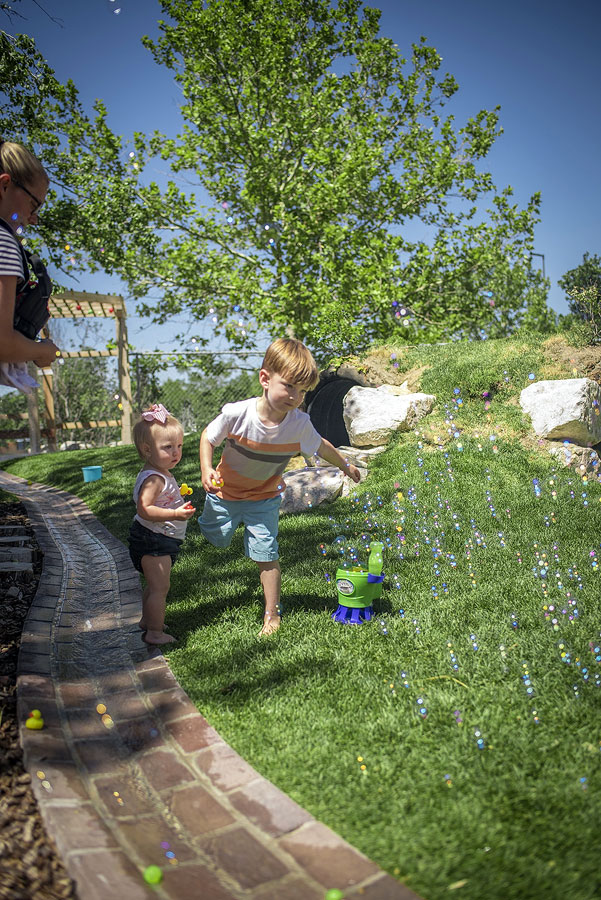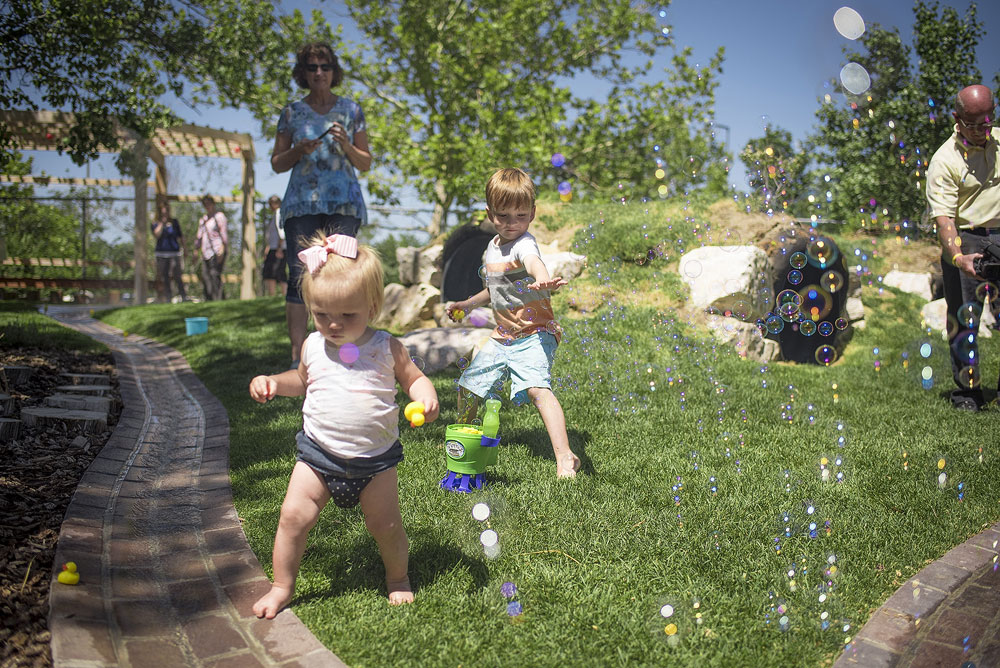 Eccles Lab School children play in a water pathway during the grand opening on Tuesday, July 12. (Duyen Nguyen)