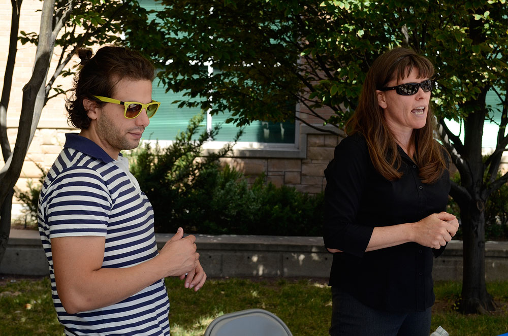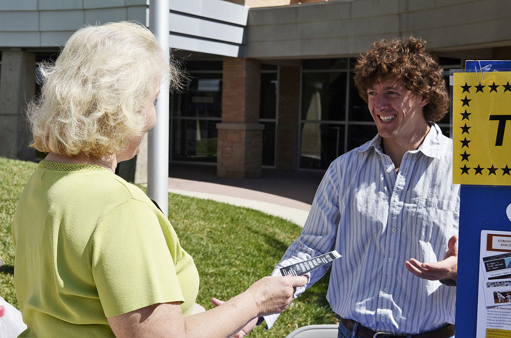 Isaac Ralphs, right, and Jan Meigs talk about SLCC tutoring services during the Academic Programs and Resource Fair at Jordan Campus on Sept. 6. (Chris Dallof)