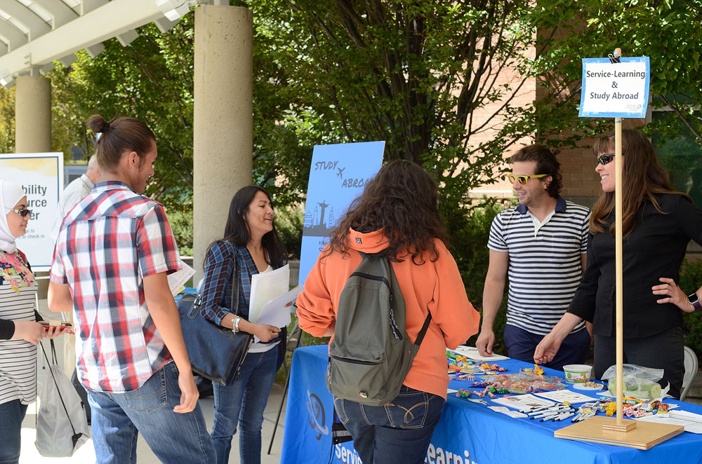 Students talk to Service Learning and Study Abroad staff members at the Academic Programs and Resource Fair at Jordan Campus on Sept. 6. (Chris Dallof)