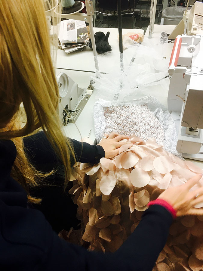 Madeline Huntsman sits at her workstation with a child’s ballet dress in front of her. On the desk is heap of tulle she intends to place inside the skirt. Now in her last year at SLCC, Huntsman is working on a spring collection with Parisian inspiration.