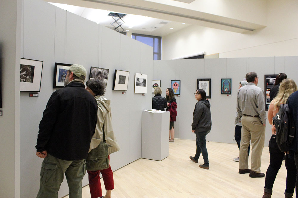 Visitors attend the 2017 Student Art Showcase in the South City Campus multipurpose room. The free exhibit will be open through Thursday, April 13. (Allison Hutto)