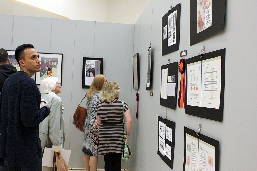 Members of the public visit the 2017 Student Art Showcase in the South City Campus multipurpose room. The showcase will be on display through Thursday, April 13. (Allison Hutto)
