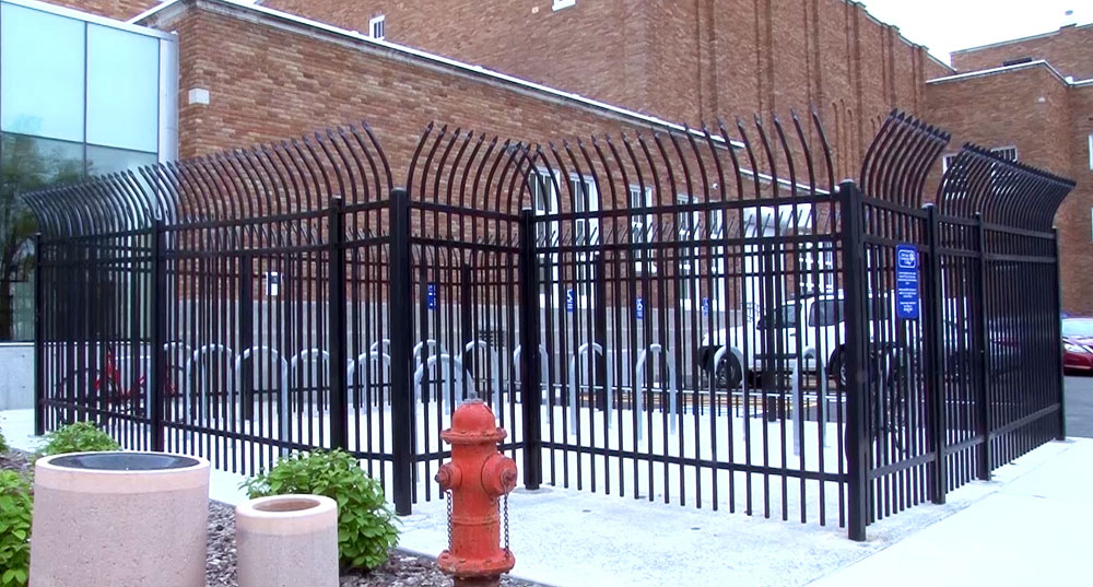 The bicycle racks near the student parking on the west side of the building are now surrounded by a tall fence. The fence curves at the top and has spikes at the end to prevent thieves from breaking in. The enclosed area can only be accessed by anyone who scans their new SLCC OneCard at the gate.