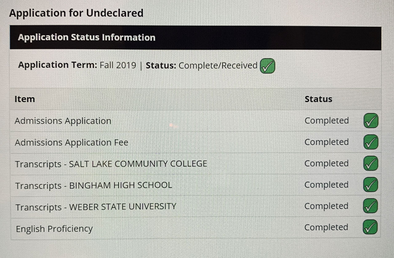 Two months later, when everyone else had posted their admission letters on social media, I started wondering what I had done wrong, so I checked my application status. All I’ll say is I gave up and changed my plans, never finishing my application, and attending Salt Lake Community College instead.