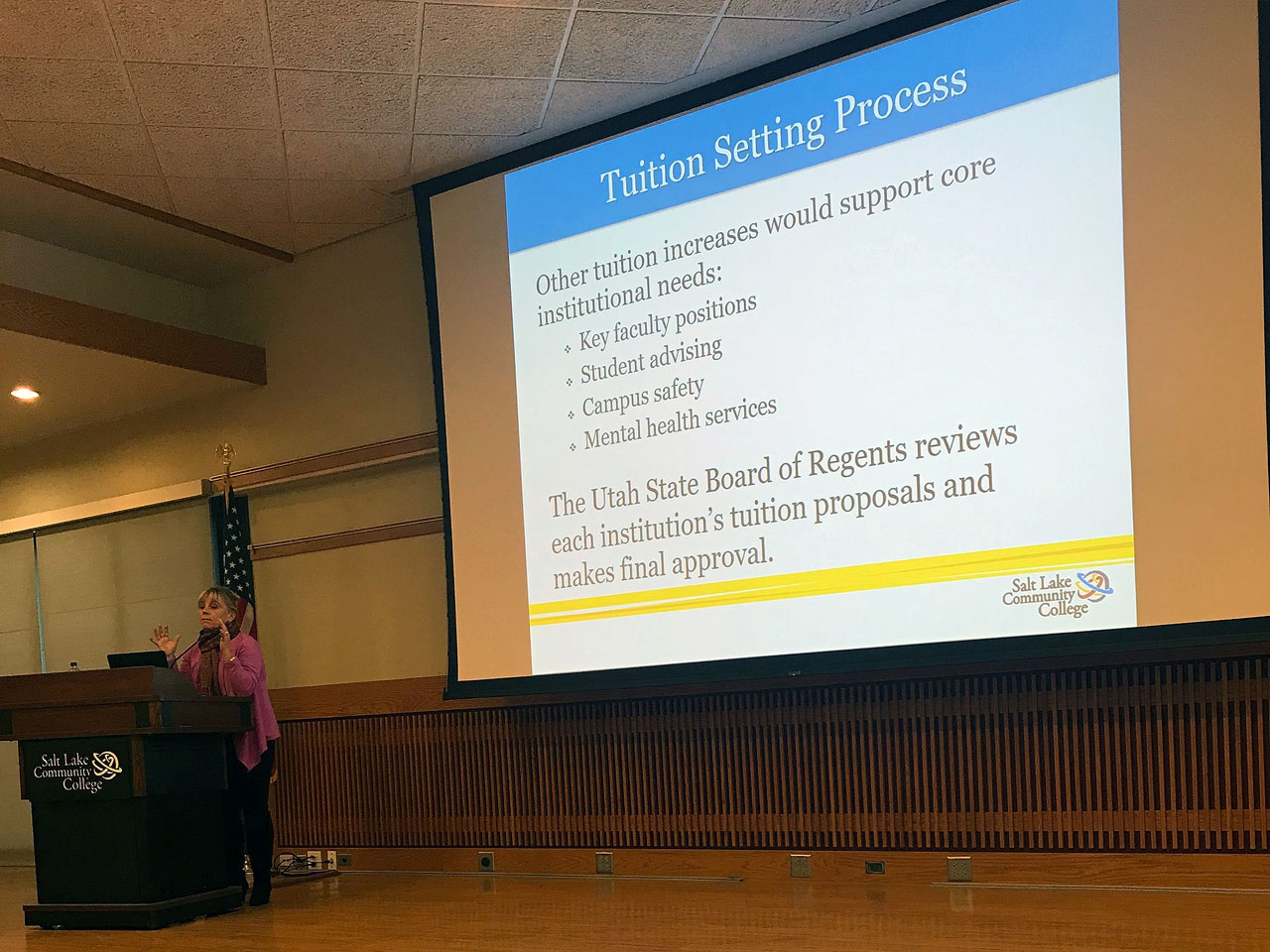 Salt Lake Community College President Deneece G. Huftalin hosted a public hearing for a proposed tuition increase Thursday at the Taylorsville Redwood Campus.