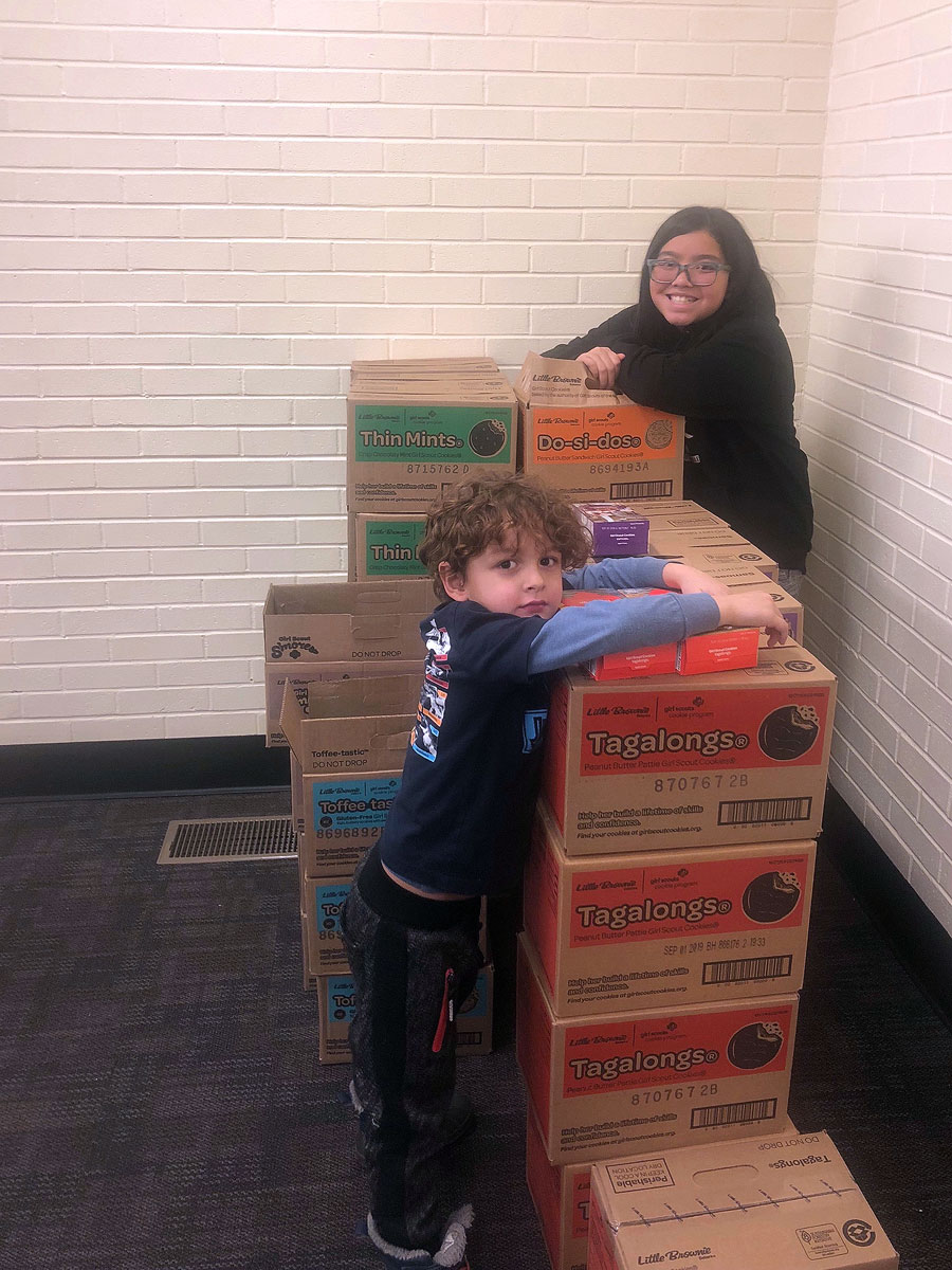 Melody Hernandez and her younger brother, Kingston, stand beside stacked boxes of Girl Scout cookies. The Girl Scout cookie program enables girls to develop essential life and business skills. (Courtesy of Melody Hernandez)