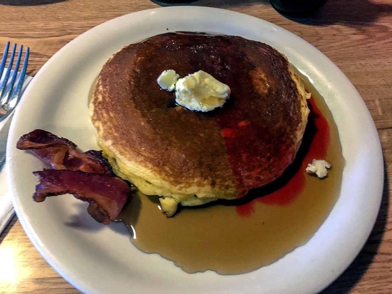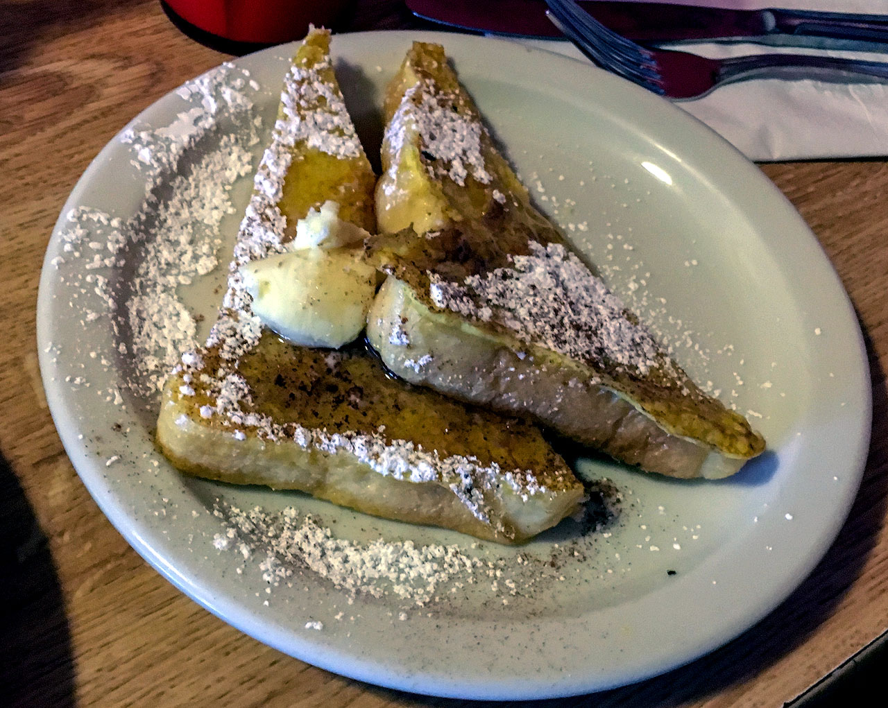 I ordered what made Penny Ann’s Cafe famous: a short stack of “Heavenly Hot Cakes” with a side of french toast and a glass of milk.