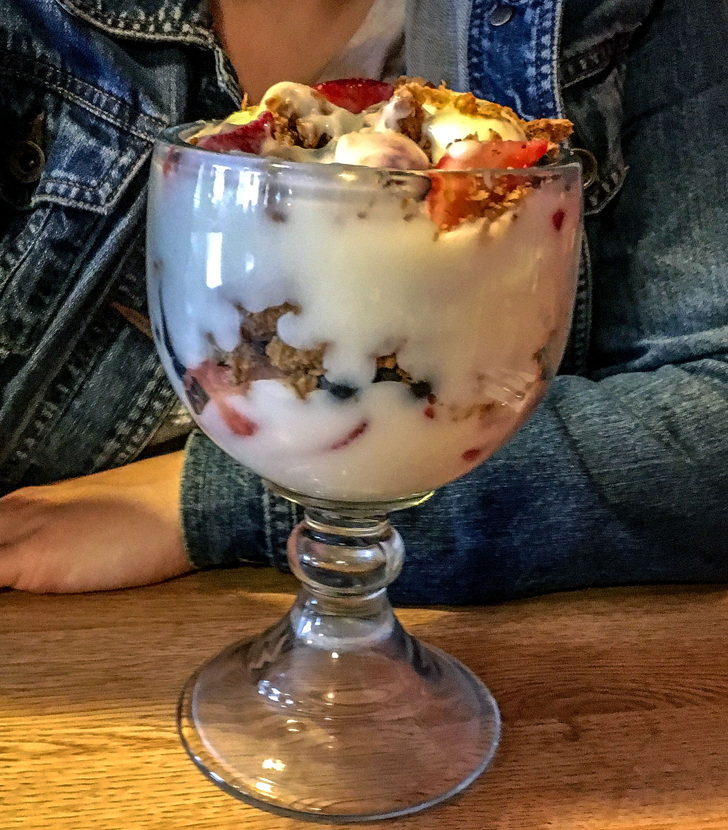 Meanwhile, Breann ordered the vanilla yogurt parfait. Once brought to our table, this mixture of fresh strawberries, blueberries, yogurt, and granola took on a new form in this appealingly majestic goblet. Breann let out a noise of disbelief, openly wondering how she would finish something of that incredible size.
