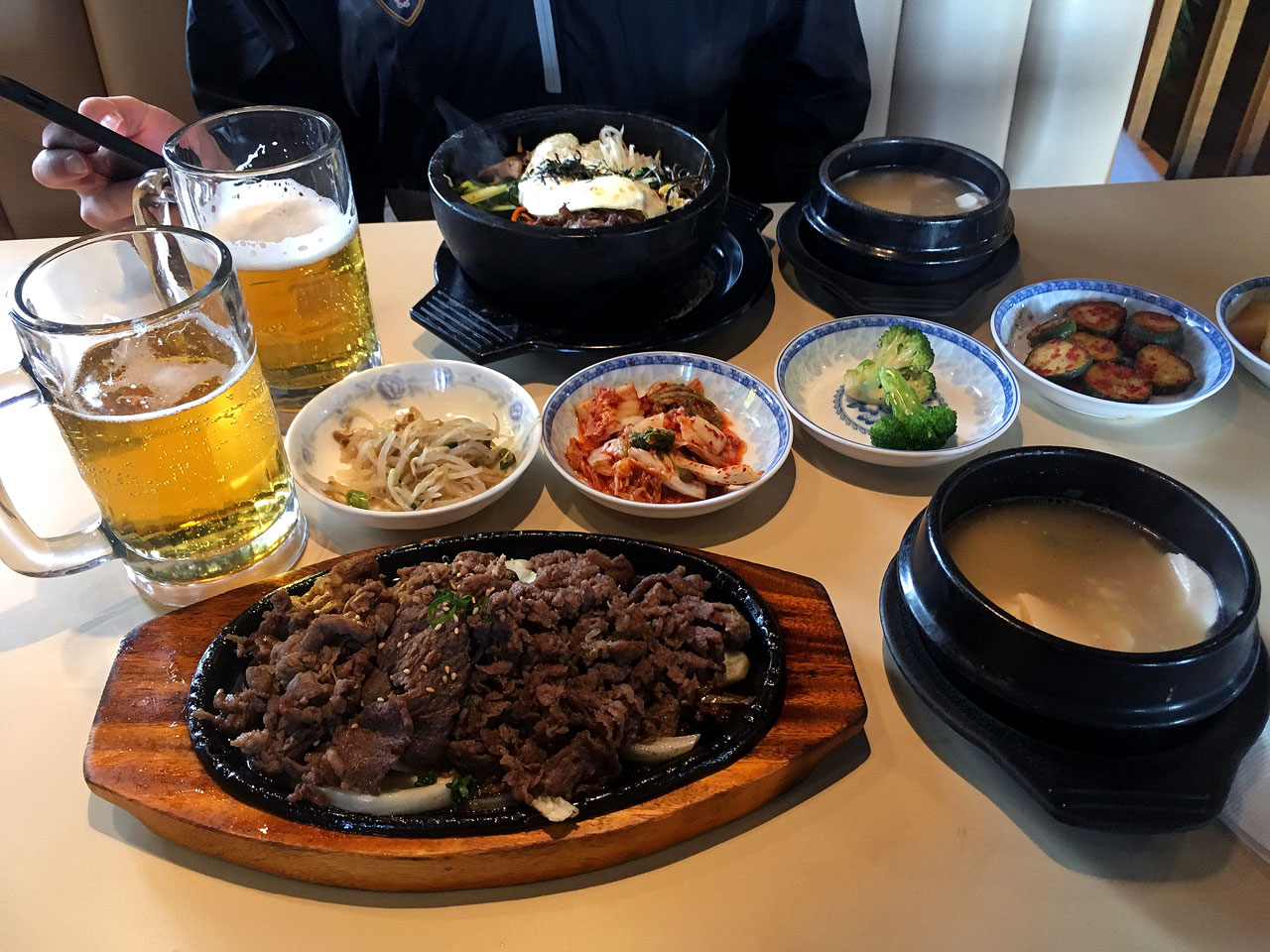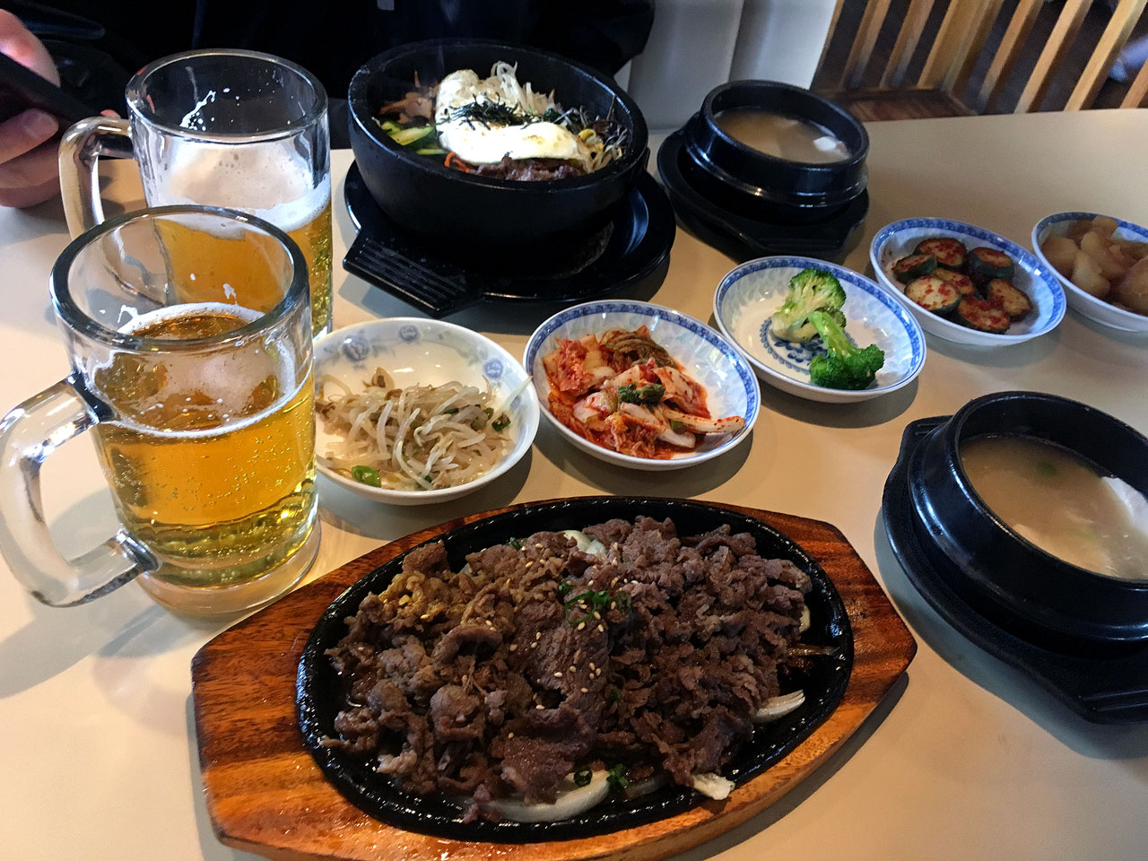 Leisurely sipping a chilled Asahi beer, the orders for one bulgogi (the direct translation is “fire meat”) and bibimbap (“mixed rice”) were in.