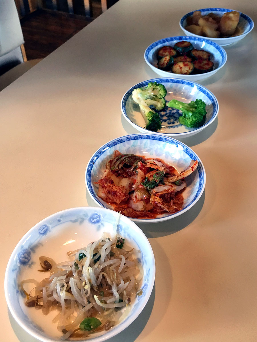 Upon being seated, the server brought out a series of small side dishes meant to prime the palette. Those dishes consisted of spicy pickled cucumbers, kimchi, bean sprouts, sesame seasoned broccoli and sweet soy sauce-soaked potatoes, all touching on an array of flavors from sweet, spicy and sour, to umami.