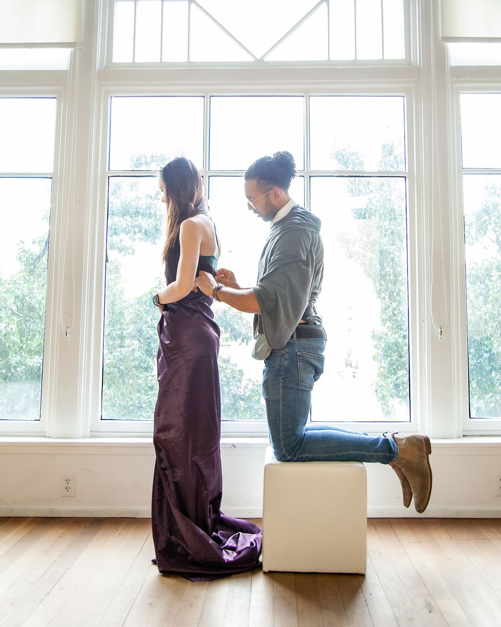 Leo Weffer dresses a model with one of his designs. Weffer, a fashion student at Salt Lake Community College, will host his own fashion show in spring 2020. (Gina Portugal)