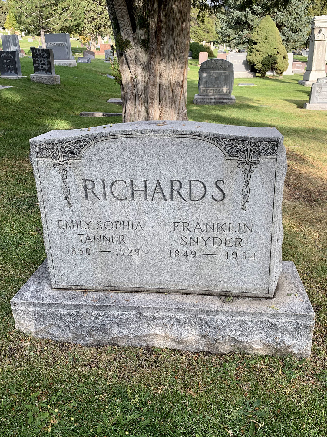 The grave marker of Emily Sophia Tanner Richards, buried next to her husband, Franklin Snyder Richards, in the Salt Lake City Cemetery. Emily Richards led the Utah Women’s Suffragist movement. (Sadie Slikker)