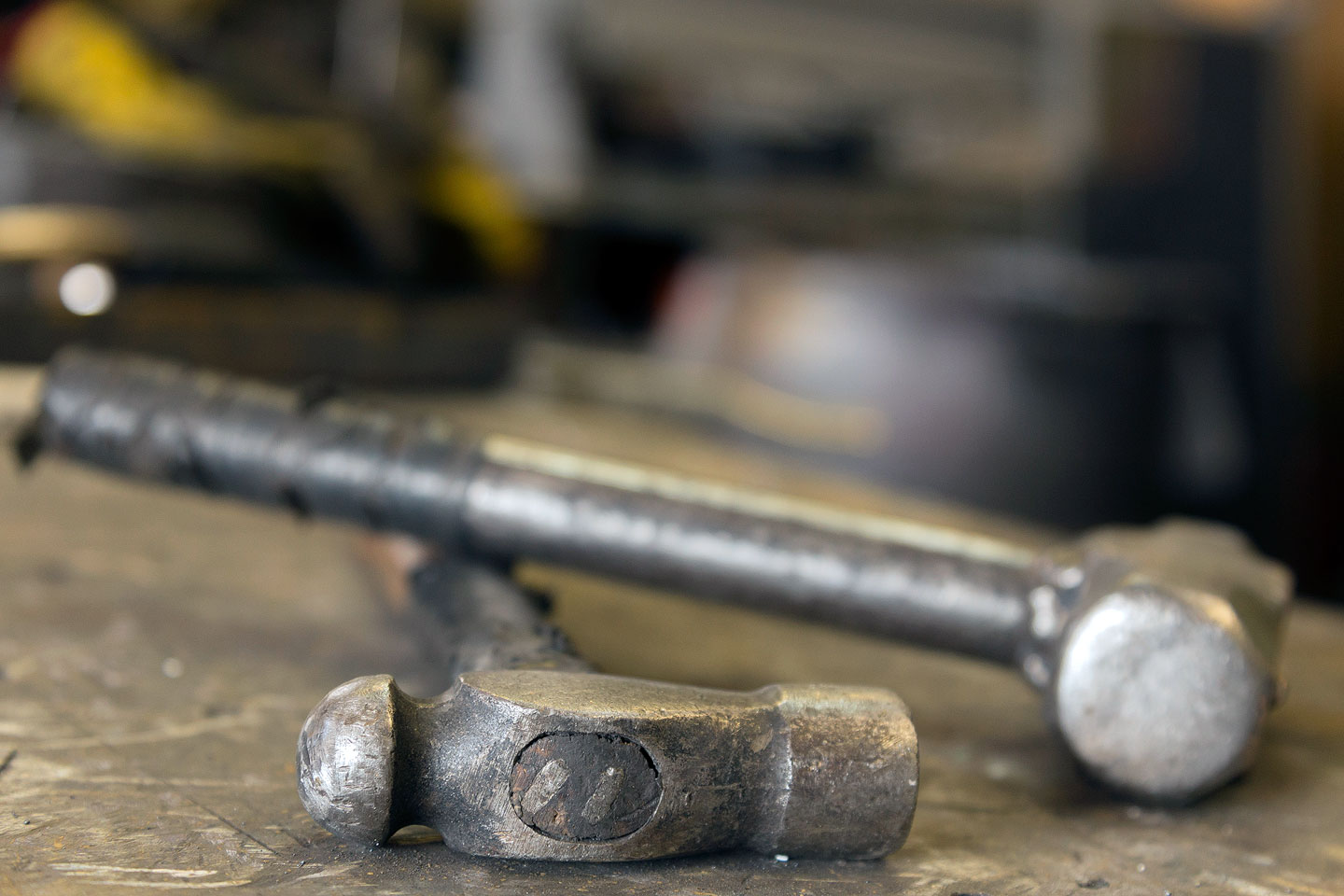 Two of Richard Prazen’s hammers lay on his workbench. These are just a couple of the countless tools in Prazen’s shop. (Will Samsky)