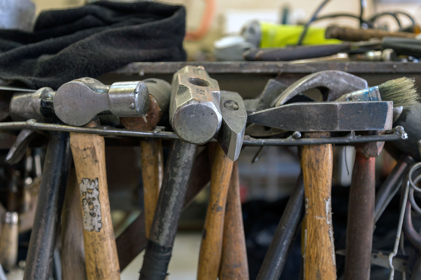 The hammers pictured are just a few of the tools that fill Richard Prazen’s shop. Prazen has several handmade tools, including his metal forge. (Will Samsky)