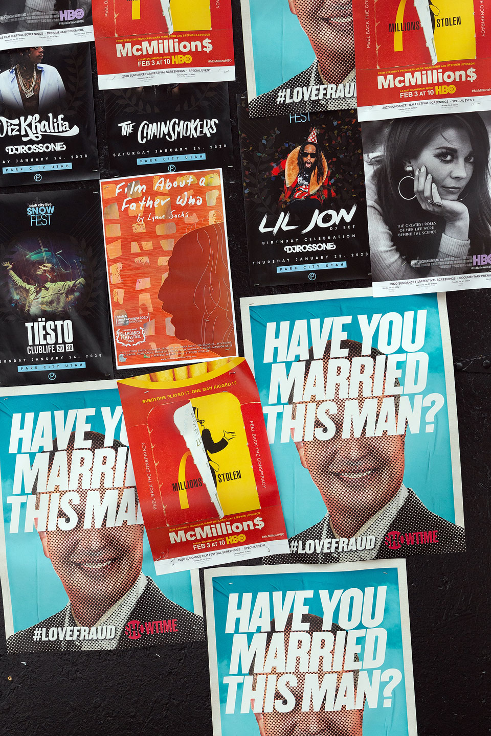 Movie and concert posters fill a marquee on Main Street. The 2020 Sundance Film Festival will show 118 feature films this year. (Will Samsky)