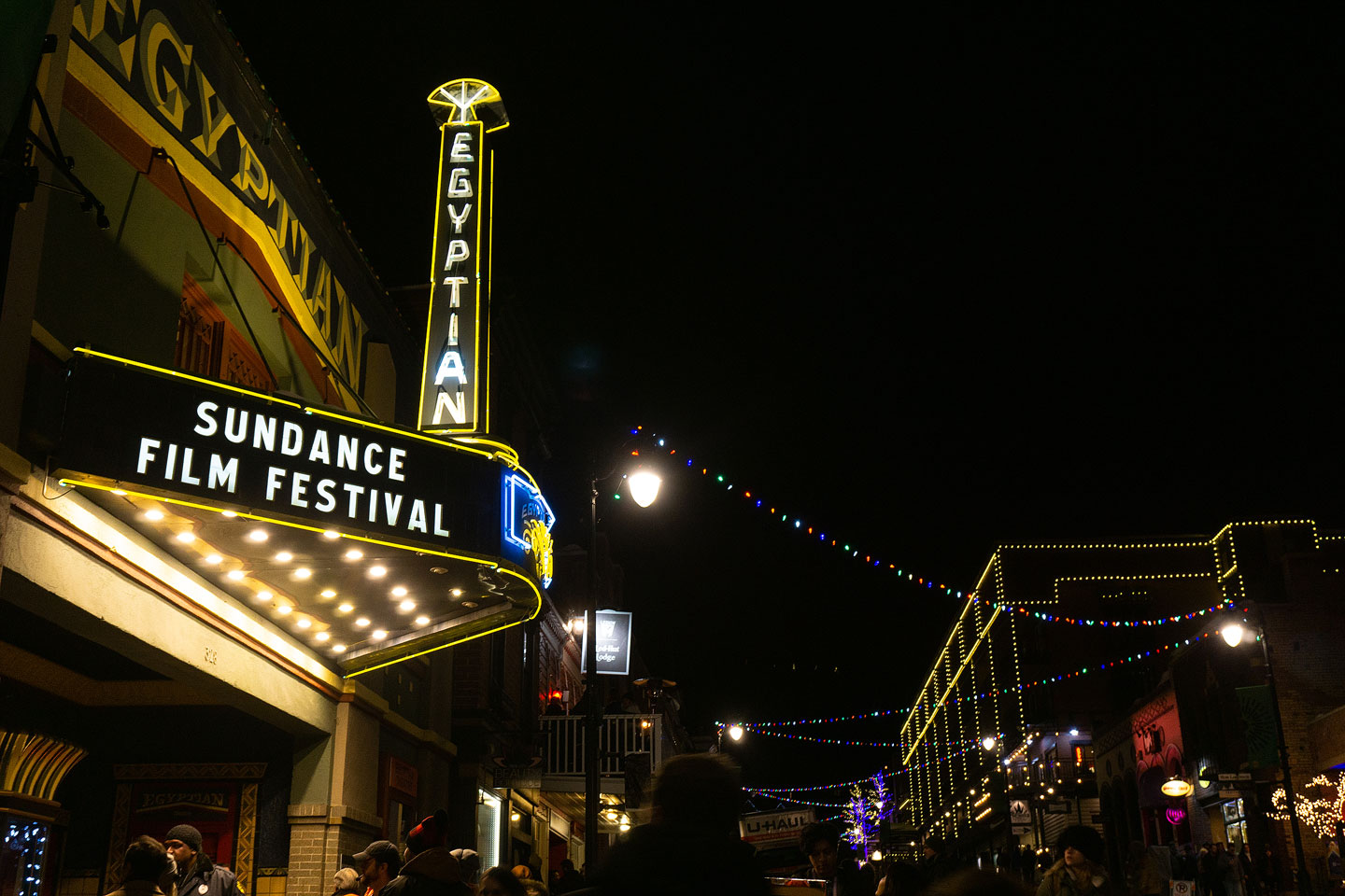 Festivalgoers wait outside under the street lights of the Egyptian Theatre on Main Street in Park City. (Jared Stanger)