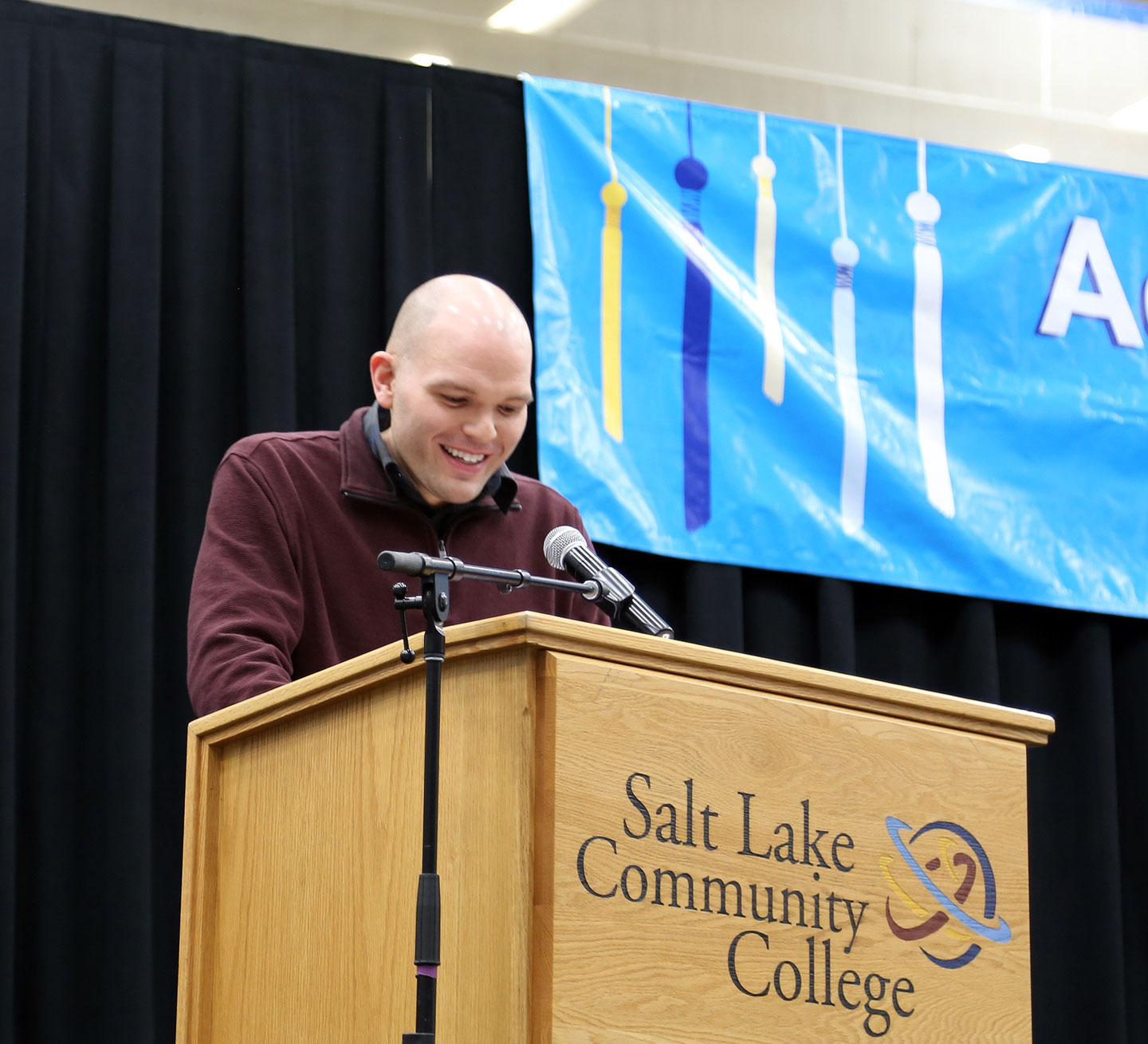 Andrew Munguia, a nursing major and an anatomy lab assistant at SLCC, shared his personal experience and struggles, recognizing and commending students for their hard work.