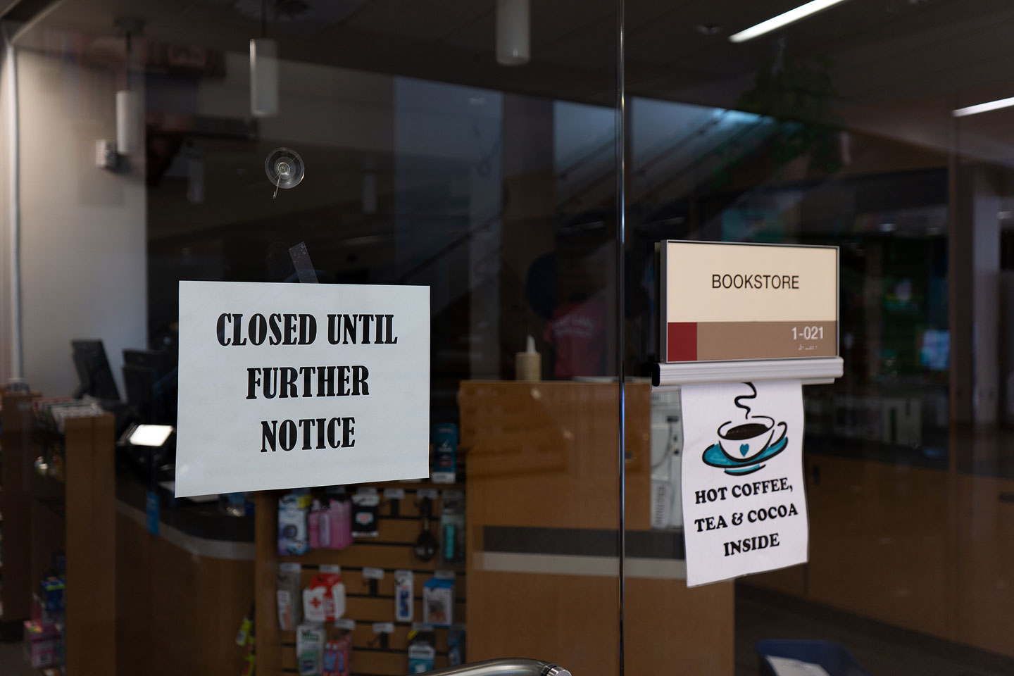 The campus, usually bustling with students, was nearly empty. A few amenities were still offered, including the library and select computer labs, but these spaces were empty of students.